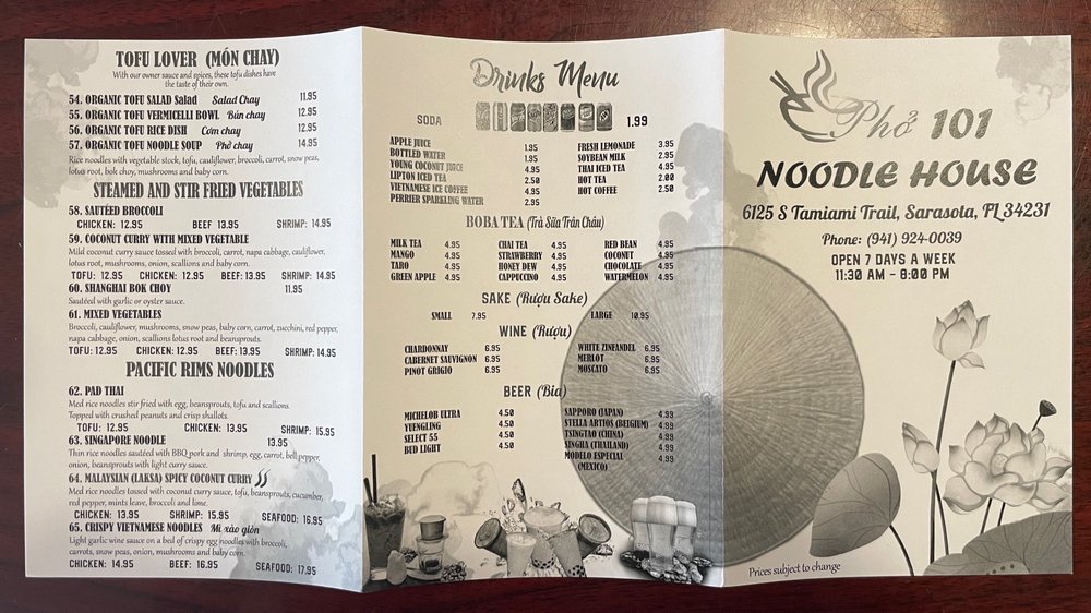 Welcome to PHO 101 Noodle House, a Vietnamese noodle haven located in Sarasota, FL. This casual and quiet restaurant offers a wide range of options, catering to vegans and vegetarians, with a menu filled with flavorful delights. From their savory Beef Noodle Soups like Rare Steak and Meatballs to their Special Noodle Soups like Spicy Beef Noodle and Beef Stew, there is something for every palate.